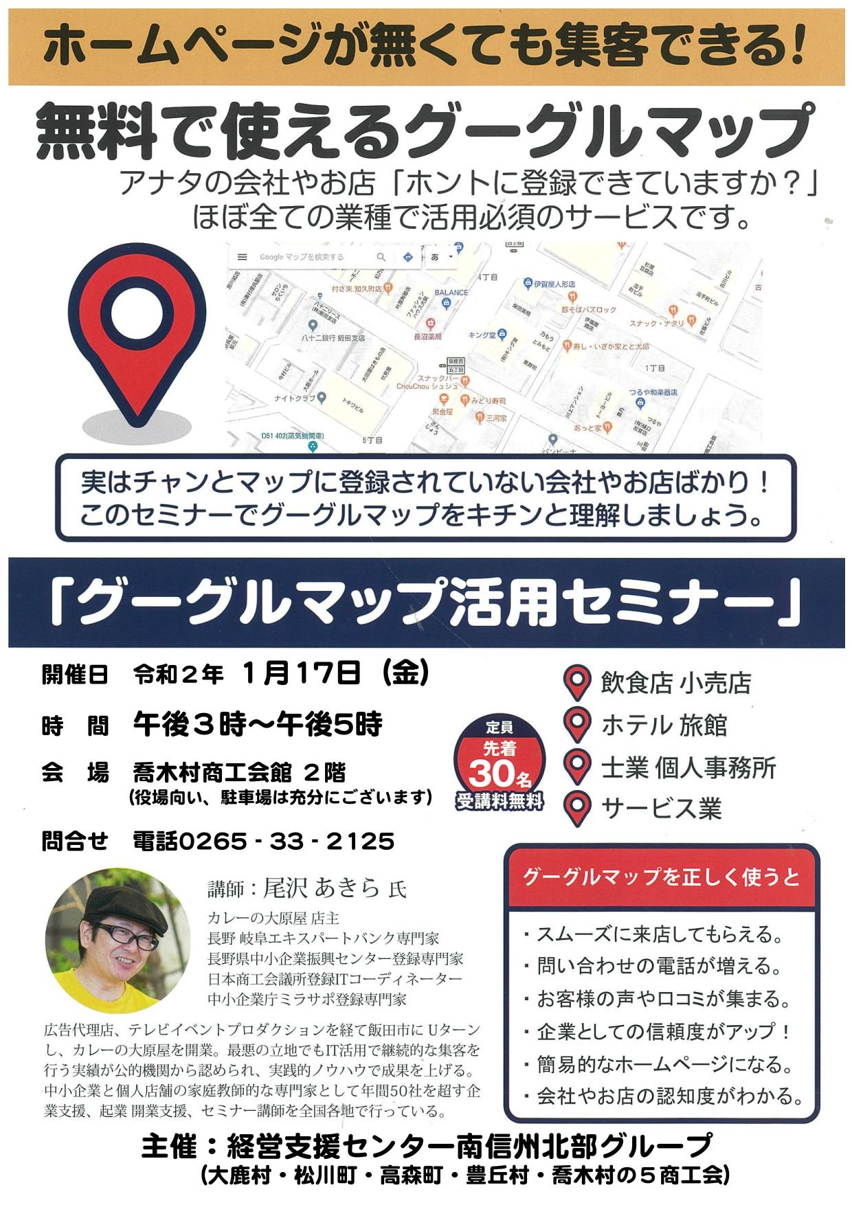 この度、講師の小沢あきら氏による「グーグルマップ活用セミナー」が喬木村商工会館で開催されます。