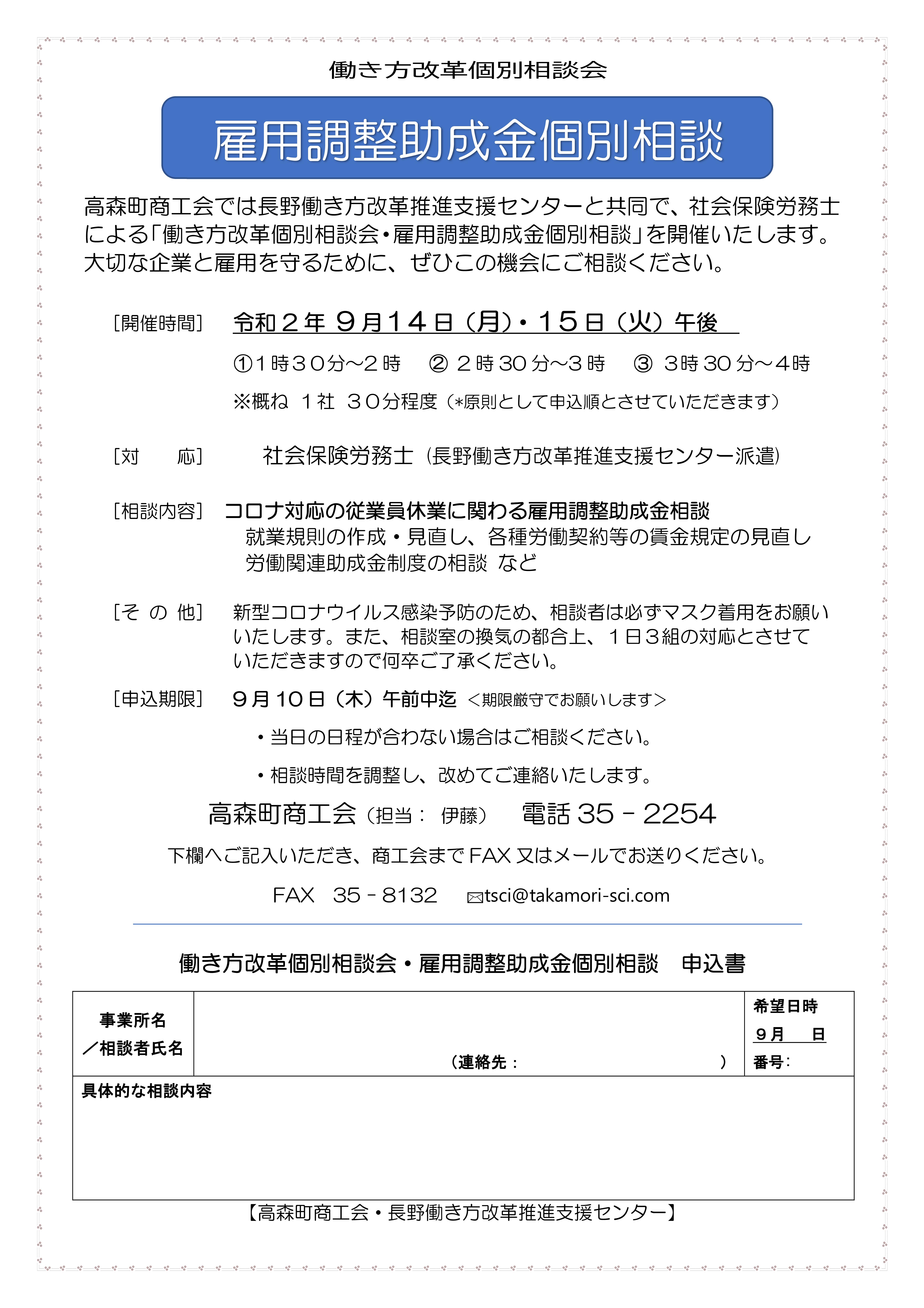 高森町商工会では長野働き方改革推進支援センターと共同で、社会保険労務士